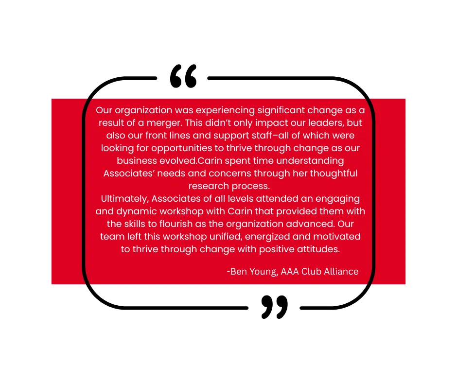 I motivate all employees to be Change Leaders – people who influence positive change – regardless of rank or title. Because of this, employees leave Carin’s talks empowered and motivated. I am consistently rated highly by employees and management alike.